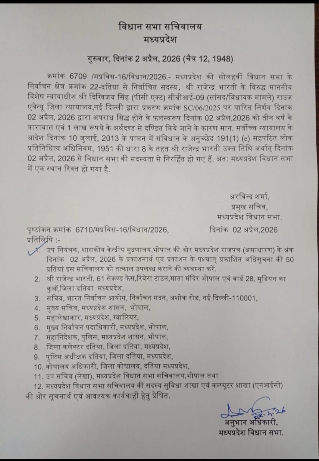 दतिया की राजनीति में एक बड़ा बदलाव देखने को मिल रहा है। राजेंद्र भारती को सजा होने के बाद उनकी विधानसभा सदस्यता समाप्त हो गई है, जिससे मध्यप्रदेश विधानसभा में दतिया सीट रिक्त हो गई है। अब इस सीट पर उपचुनाव होना तय माना जा रहा है।